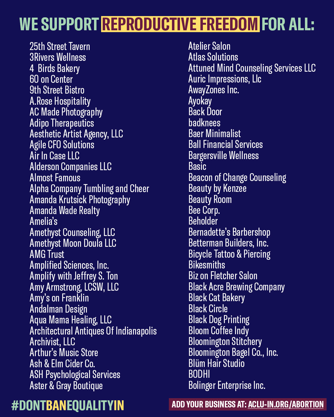Aclu Of Indiana On Twitter Banning Abortion Is Bad For Business That S Why These 500 Indiana Businesses Across 60 Cities Are Taking A Stance In Support Of Reproductive Freedom Dontbanequalityin Https T Co Uilhd3yybt